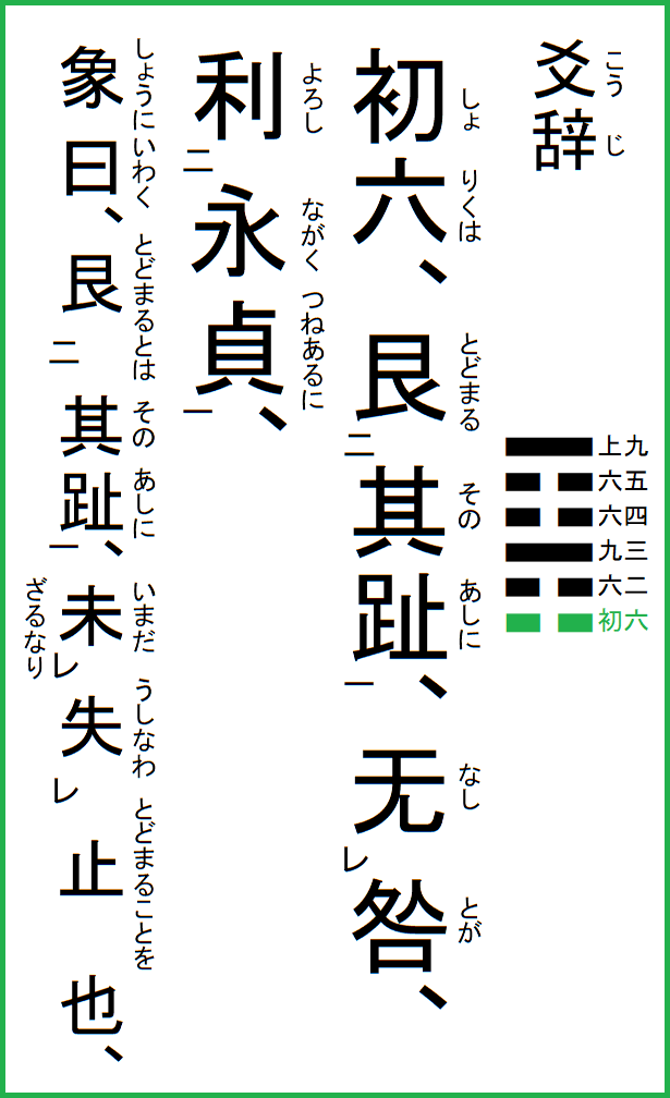 初六は、其の趾に艮まる、咎无し、永く貞あるに利ろし、