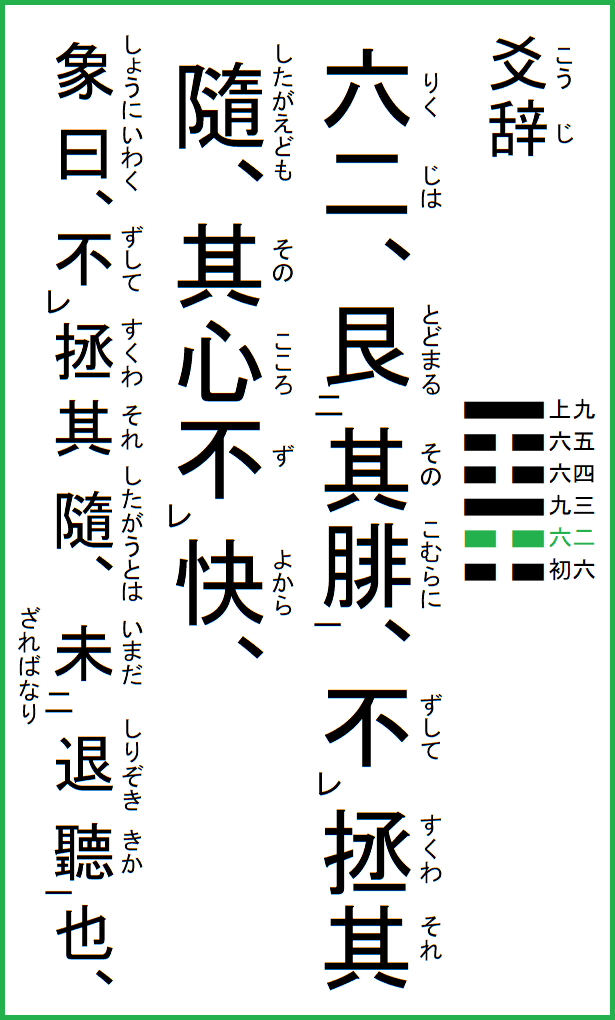 もとより六二は、中正にしてよく艮止の道を得ている者だが、陰柔なので微力にして、仕方なく内卦艮の主である九三陽剛に比し従ってしまう。