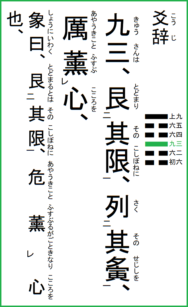 九三は、其の限に艮まり、其の夤を列く、獅ォこと心を薫ぶ、
