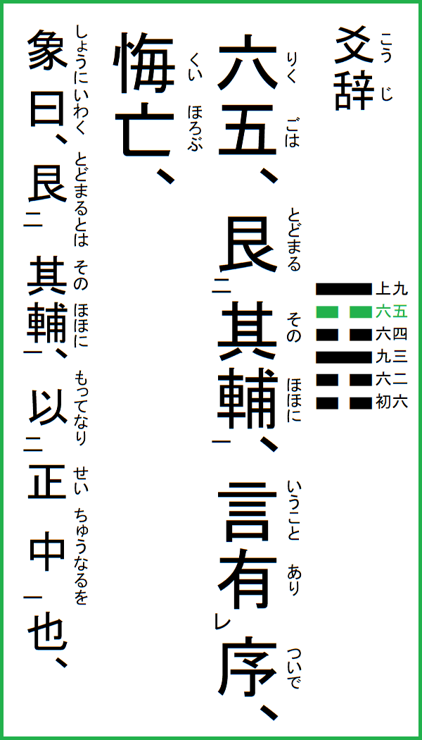 六五は、其の輔に艮まる、言うこと序有り、悔い亡ぶ、