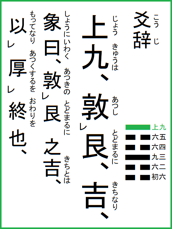 上九は、艮まるに敦し、吉なり、