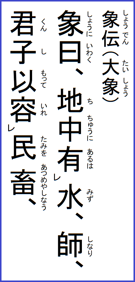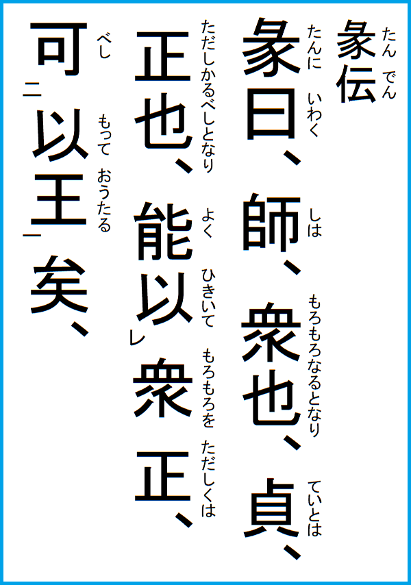 象に曰く、大君の命有りとは、以って功を正しくするなり、小人は用うること勿れとは、必ず邦を乱せばなり、