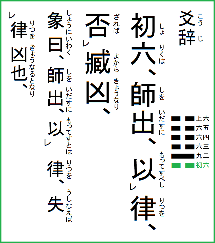 初六は、師を出すに律を以ってすべし、臧ら否れば凶なり、