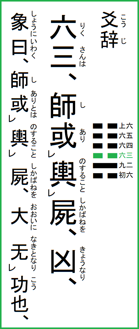 六三は、師屍を輿すること或り、凶なり、