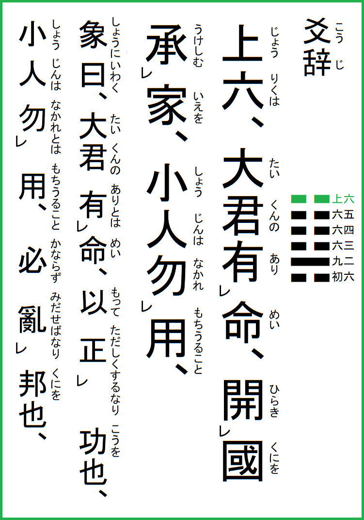 上六、大君有命、開國承家、小人勿用、