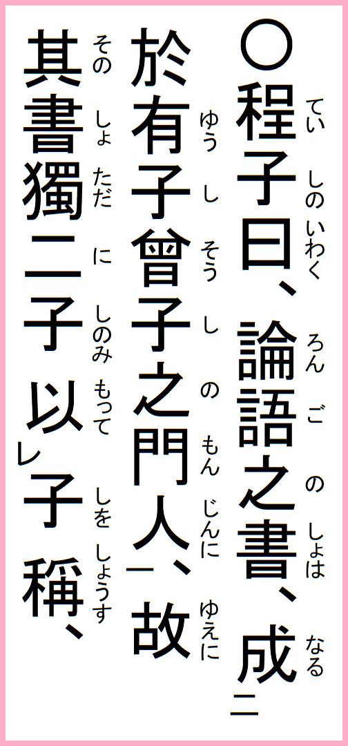 程子の曰く、論語の書は、有子曽子の門人になる、故に其の書ただ二子のみ子を以って称す、