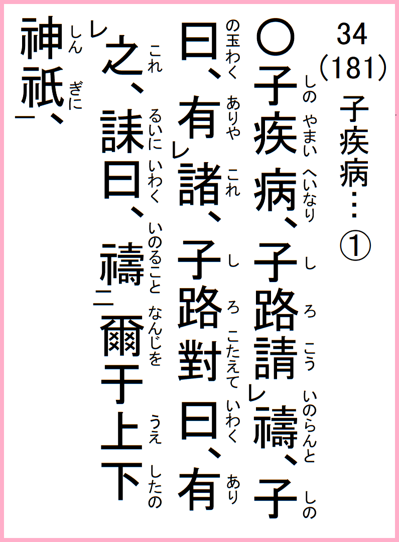子の疾い病なり、子路、祷らんと請う、子の曰く、諸れ有りや、子路対えて曰く、誄に曰、爾を上下の神祇に祷ると、