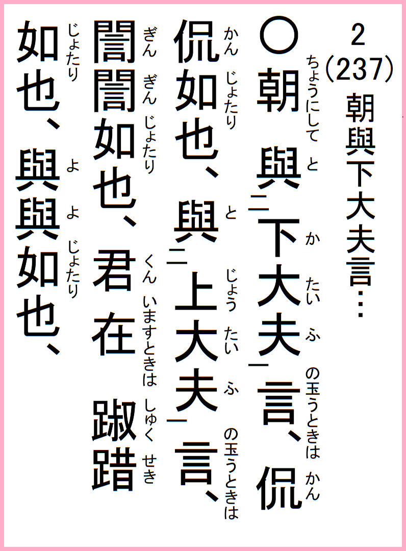 朝與下大夫言、侃侃如也、與上大夫言、ァァ如也、君在踧踖如也、與與如也、