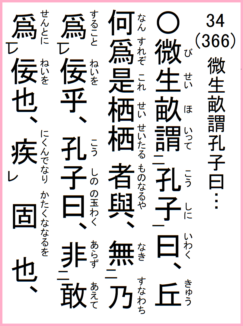 微生畝、孔子に謂って曰く、丘、何ん為れぞ是れ栖栖たる者なるや、乃ち佞を為ること無き、孔子の曰く、敢えて佞を為んとに非ず、固ななるを疾んでなり、