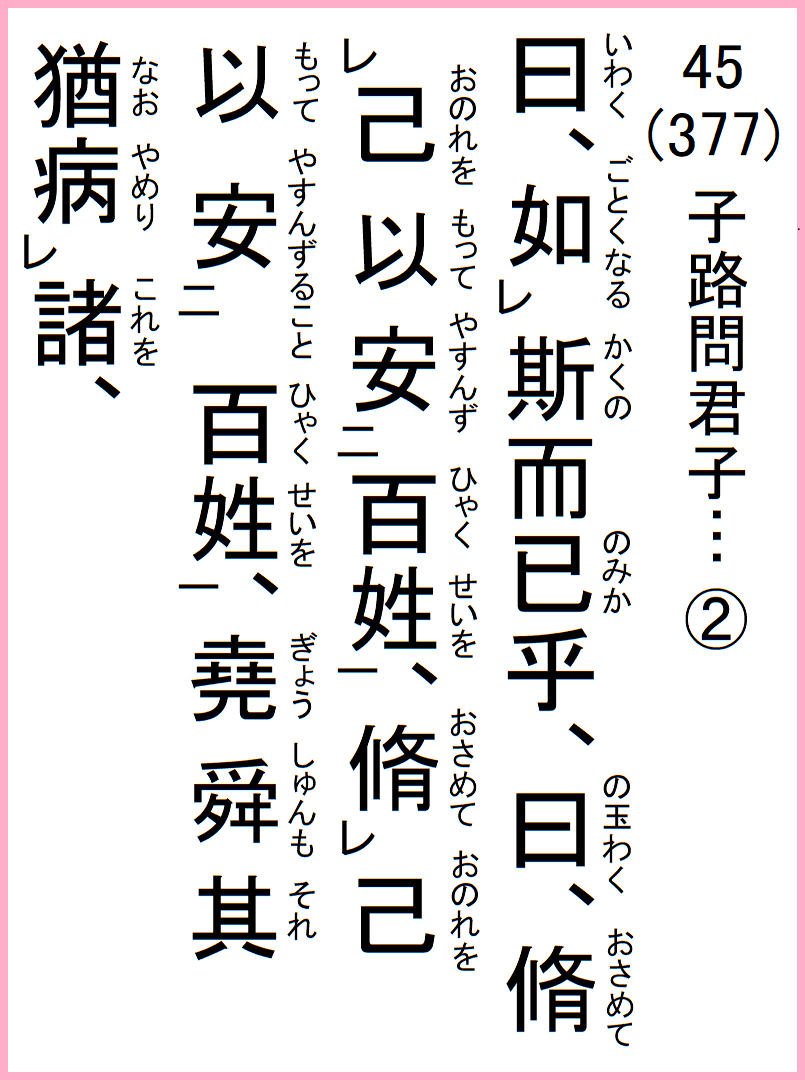 曰、如斯而已乎、曰、脩己以安百姓、脩己以安百姓、堯舜其猶病諸、