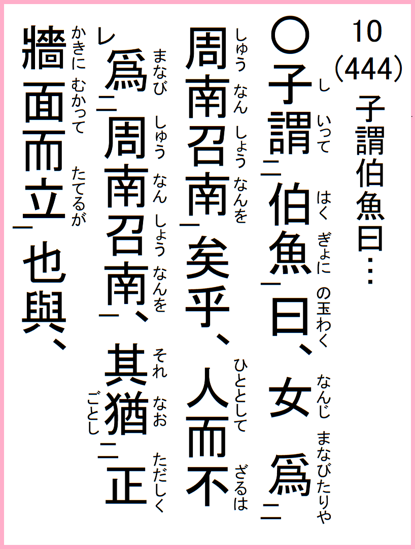 子 伯魚に謂って曰く、汝、周南召南を為びたりや、人として周南召南を為びざるは、其れ、猶、正しく牆に面って立てるが如し、