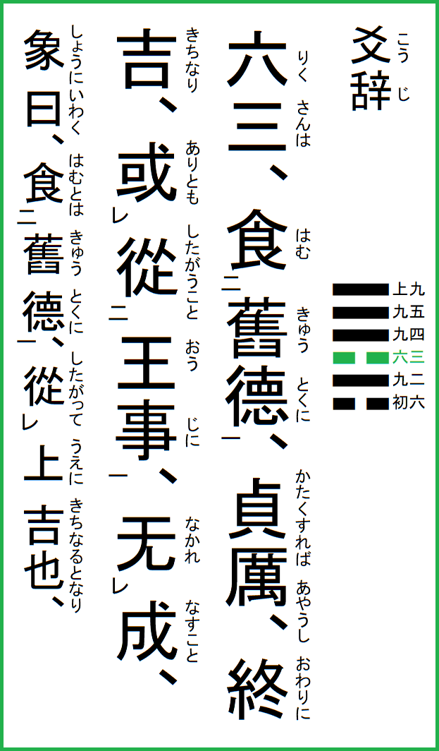 究極の易経解説 メニュー 01.乾為天 02.坤為地 03.水雷屯 04.山水蒙 05.水天需 06.天水訟 07.地水師 08.水地比 09.風天小畜 10.天沢履 11.地天泰 12.天地否 13.天火同人 14.火天大有 15.地山謙 16.雷地予 17.沢雷随 18.山風蠱 19.地沢臨 20.風地観 21.火雷噬嗑 22.山火賁 23.山地剥 24.地雷復 25.天雷无妄 26.山天大畜 27.山雷頤 28.沢風大過 29.坎為水 30.離為火 31.沢山咸 32.雷風恒 33.天山遯 34.雷天大壮 35.火地晋 36.地火明夷 37.風火家人 38.火沢睽 39.水山蹇 40.雷水解 41.山沢損 42.風雷益 43.沢天夬 44.天風姤 45.沢地萃 46.地風升 47.沢水困 48.水風井 49.沢火革 50.火風鼎 51.震為雷 52.艮為山 53.風山漸 54.雷沢帰妹 55.雷火豊 56.火山旅 57.巽為風 58.兌為沢 59.風水渙 60.水沢節 61.風沢中孚 62.雷山小過 63.水火既済 64.火水未済 |