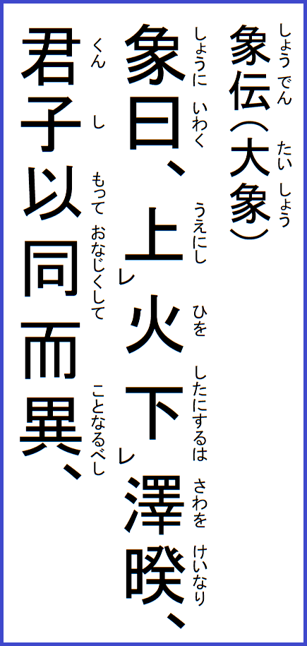 なお、火を上にして水を下にするのは、火水未済も同じだが、火水未済は離火と坎水という正対の卦の組み合わせであり、この火沢睽は離火と兌水で正対の組み合わせではない。 また、この卦は離の中女が上に在り、兌の少女が下に居る形でもあり、これは二女同居の様子である。 ところで、「そむく」という意の字は、背く、乖く、などもあるが、何故、他ではあまり使われることのない睽が用いられたのだろうか。 |