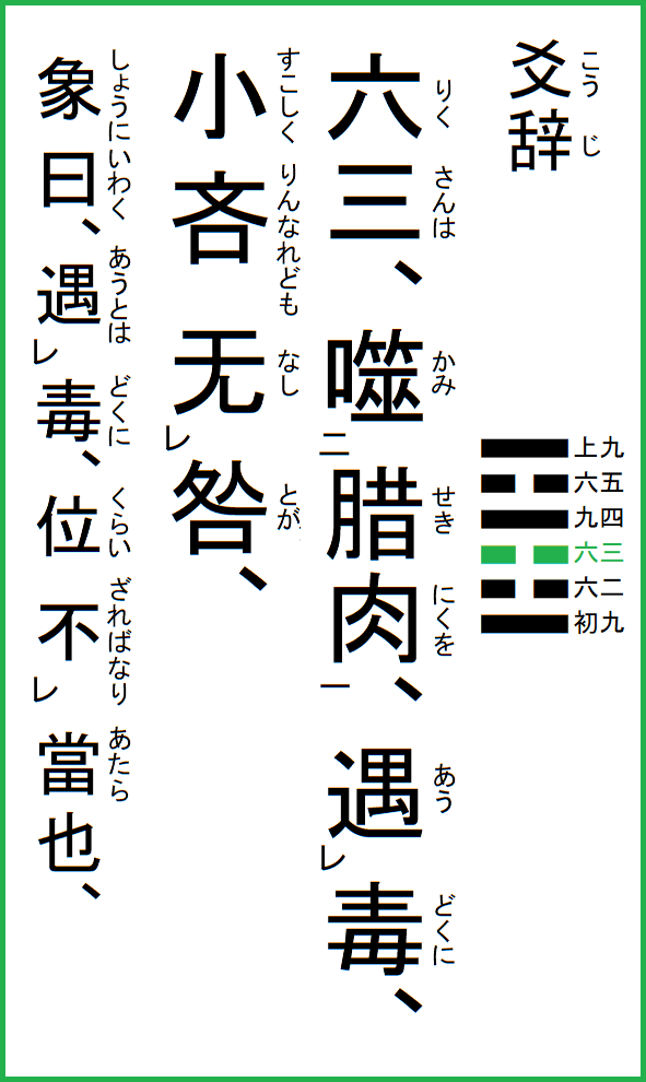 六三は、腊肉を噬み、毒に遇う、小しく吝なれども、咎无し、
