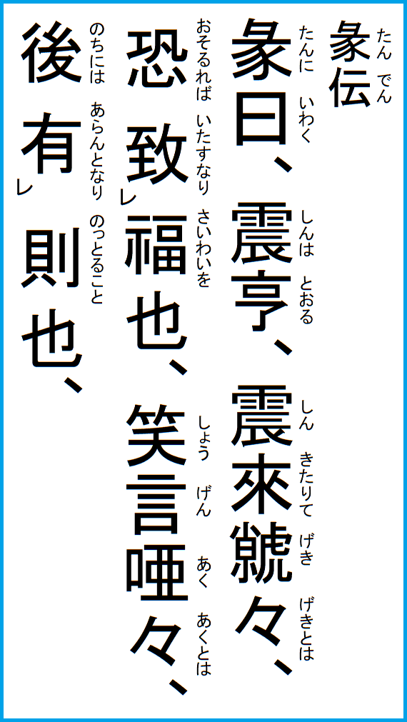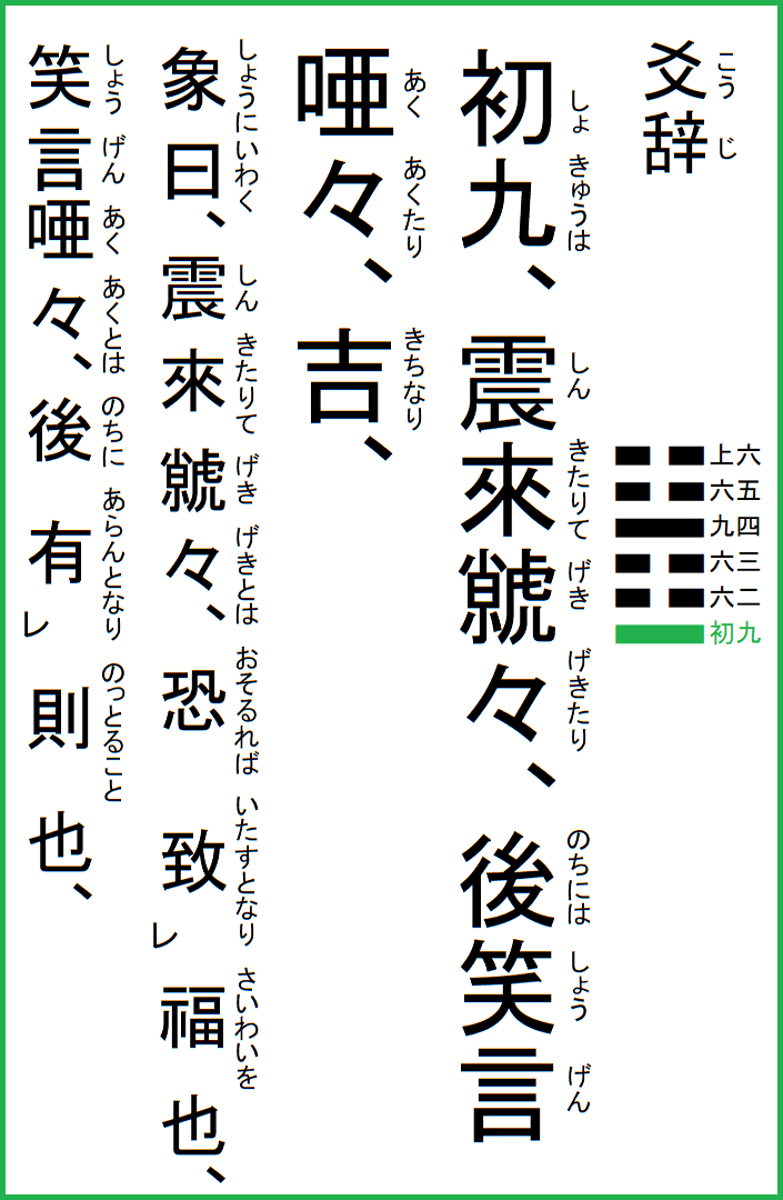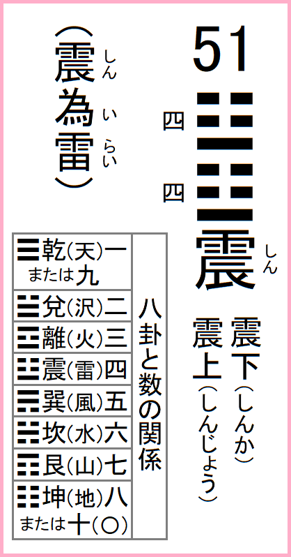 前の卦=50火風鼎 次の卦=52艮為山 51震為雷 しんいらい八卦の この卦は八卦の震を重ねた形なので、八卦と同じ震と名付けられた。 |