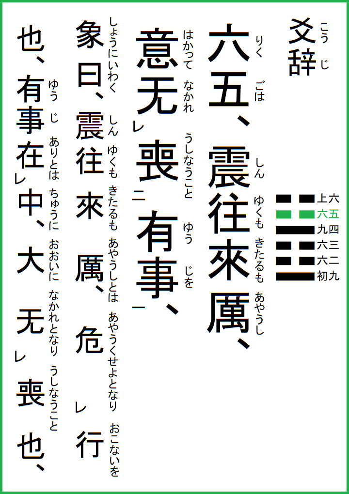 | 究極の易経解説 メニュー 01.乾為天 02.坤為地 03.水雷屯 04.山水蒙 05.水天需 06.天水訟 07.地水師 08.水地比 09.風天小畜 10.天沢履 11.地天泰 12.天地否 13.天火同人 14.火天大有 15.地山謙 16.雷地予 17.沢雷随 18.山風蠱 19.地沢臨 20.風地観 21.火雷噬嗑 22.山火賁 23.山地剥 24.地雷復 25.天雷无妄 26.山天大畜 27.山雷頤 28.沢風大過 29.坎為水 30.離為火 31.沢山咸 32.雷風恒 33.天山遯 34.雷天大壮 35.火地晋 36.地火明夷 37.風火家人 38.火沢睽 39.水山蹇 40.雷水解 41.山沢損 42.風雷益 43.沢天夬 44.天風姤 45.沢地萃 46.地風升 47.沢水困 48.水風井 49.沢火革 50.火風鼎 51.震為雷 52.艮為山 53.風山漸 54.雷沢帰妹 55.雷火豊 56.火山旅 57.巽為風 58.兌為沢 59.風水渙 60.水沢節 61.風沢中孚 62.雷山小過 63.水火既済 64.火水未済 |