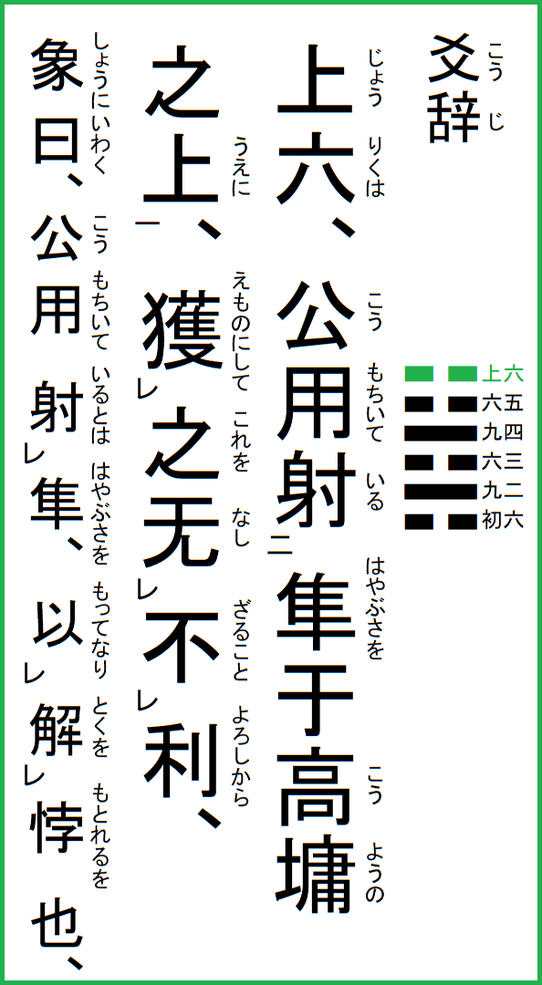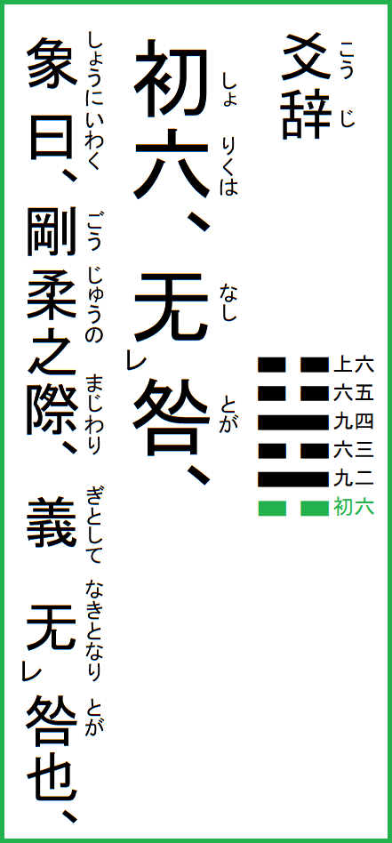 | 究極の易経解説 メニュー 01.乾為天 02.坤為地 03.水雷屯 04.山水蒙 05.水天需 06.天水訟 07.地水師 08.水地比 09.風天小畜 10.天沢履 11.地天泰 12.天地否 13.天火同人 14.火天大有 15.地山謙 16.雷地予 17.沢雷随 18.山風蠱 19.地沢臨 20.風地観 21.火雷噬嗑 22.山火賁 23.山地剥 24.地雷復 25.天雷无妄 26.山天大畜 27.山雷頤 28.沢風大過 29.坎為水 30.離為火 31.沢山咸 32.雷風恒 33.天山遯 34.雷天大壮 35.火地晋 36.地火明夷 37.風火家人 38.火沢睽 39.水山蹇 40.雷水解 41.山沢損 42.風雷益 43.沢天夬 44.天風姤 45.沢地萃 46.地風升 47.沢水困 48.水風井 49.沢火革 50.火風鼎 51.震為雷 52.艮為山 53.風山漸 54.雷沢帰妹 55.雷火豊 56.火山旅 57.巽為風 58.兌為沢 59.風水渙 60.水沢節 61.風沢中孚 62.雷山小過 63.水火既済 64.火水未済 |