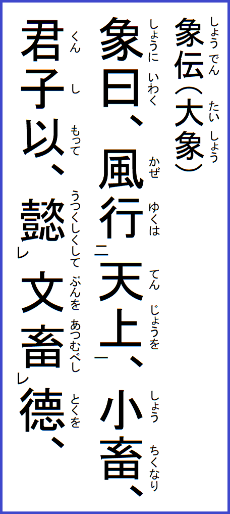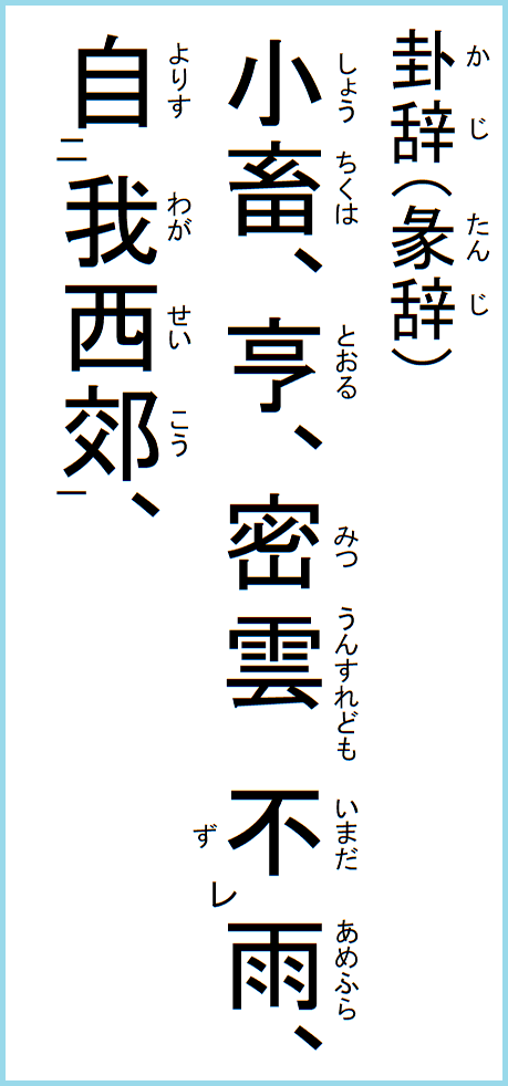 卦辞 小畜、亨、密雲不雨、自我西郊、【書き下し】 ※ 不は未と同義。 小畜は止めるということだが、一陰の六四が心を尽くして五陽を止め得れば、陰陽の情は相和し、双方の思いは亨通する。 |