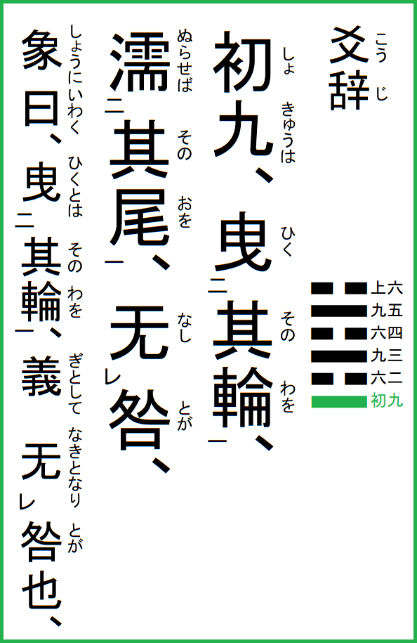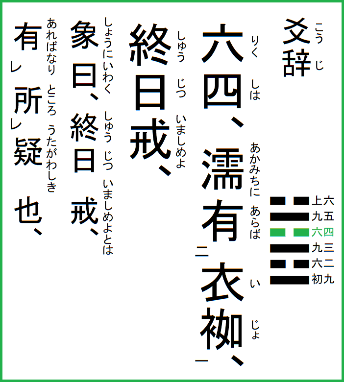 | 究極の易経解説 メニュー 01.乾為天 02.坤為地 03.水雷屯 04.山水蒙 05.水天需 06.天水訟 07.地水師 08.水地比 09.風天小畜 10.天沢履 11.地天泰 12.天地否 13.天火同人 14.火天大有 15.地山謙 16.雷地予 17.沢雷随 18.山風蠱 19.地沢臨 20.風地観 21.火雷噬嗑 22.山火賁 23.山地剥 24.地雷復 25.天雷无妄 26.山天大畜 27.山雷頤 28.沢風大過 29.坎為水 30.離為火 31.沢山咸 32.雷風恒 33.天山遯 34.雷天大壮 35.火地晋 36.地火明夷 37.風火家人 38.火沢睽 39.水山蹇 40.雷水解 41.山沢損 42.風雷益 43.沢天夬 44.天風姤 45.沢地萃 46.地風升 47.沢水困 48.水風井 49.沢火革 50.火風鼎 51.震為雷 52.艮為山 53.風山漸 54.雷沢帰妹 55.雷火豊 56.火山旅 57.巽為風 58.兌為沢 59.風水渙 60.水沢節 61.風沢中孚 62.雷山小過 63.水火既済 64.火水未済 |