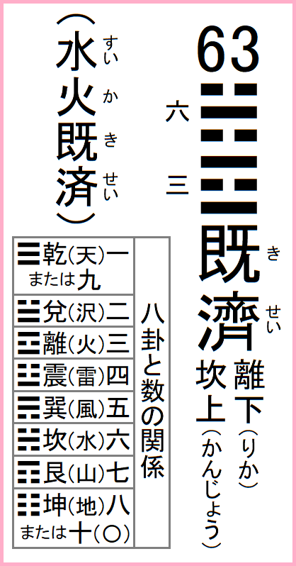 前の卦=62雷山小過 次の卦=64火水未済 63水火既済 すいかきせいキリストが馬小屋で生まれ救世主と呼ばれたことと、ユダヤ暦元年計算起点となった卦。詳細はコチラ。 八卦の