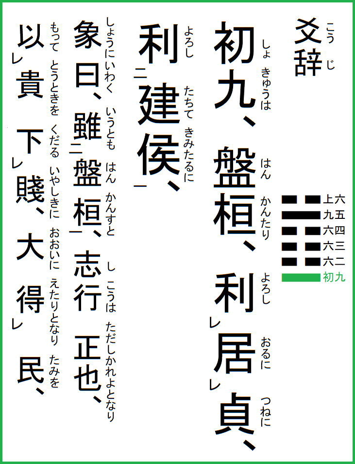 もし、震雷が上に上り、坎の雲が雨となって下に降る時は、この欝蟄の気も解き放たれて散り、雨の潤いも草木百物に充ち及ぶことになる。 また、下卦を内、上卦を外とすれば、坎は険難、震は動くだから、坎の険難の中で動き、未だその中から出られないことを示している。 また、合体の象を以って見るときは、九五の君は坎の険難の中に陥り、初九の侯が下に在って震の勢いを得た様子。 また、来往生卦法では、この水雷屯は水地比から来たものとする。 |