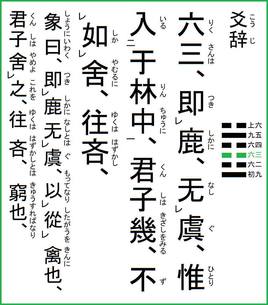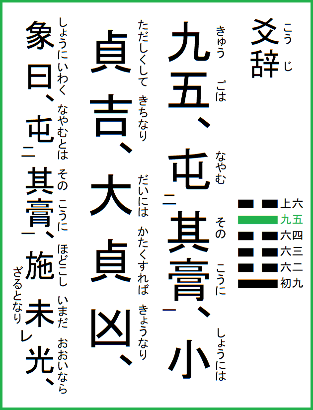 究極の易経解説 メニュー 01.乾為天 02.坤為地 03.水雷屯 04.山水蒙 05.水天需 06.天水訟 07.地水師 08.水地比 09.風天小畜 10.天沢履 11.地天泰 12.天地否 13.天火同人 14.火天大有 15.地山謙 16.雷地予 17.沢雷随 18.山風蠱 19.地沢臨 20.風地観 21.火雷噬嗑 22.山火賁 23.山地剥 24.地雷復 25.天雷无妄 26.山天大畜 27.山雷頤 28.沢風大過 29.坎為水 30.離為火 31.沢山咸 32.雷風恒 33.天山遯 34.雷天大壮 35.火地晋 36.地火明夷 37.風火家人 38.火沢睽 39.水山蹇 40.雷水解 41.山沢損 42.風雷益 43.沢天夬 44.天風姤 45.沢地萃 46.地風升 47.沢水困 48.水風井 49.沢火革 50.火風鼎 51.震為雷 52.艮為山 53.風山漸 54.雷沢帰妹 55.雷火豊 56.火山旅 57.巽為風 58.兌為沢 59.風水渙 60.水沢節 61.風沢中孚 62.雷山小過 63.水火既済 64.火水未済 |