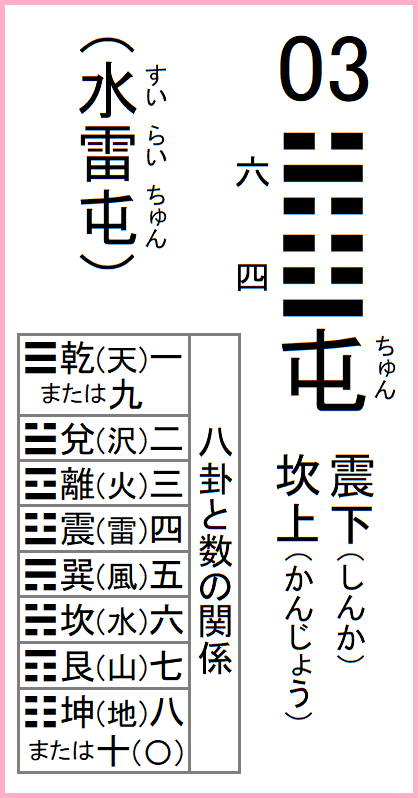 前の卦=02坤為地 次の卦=04山水蒙 03水雷屯 すいらいちゅん「旧約聖書」天地創造1日目を構成する5卦(未済・乾・坤・屯・蒙)のひとつ。詳細はコチラ。 八卦の