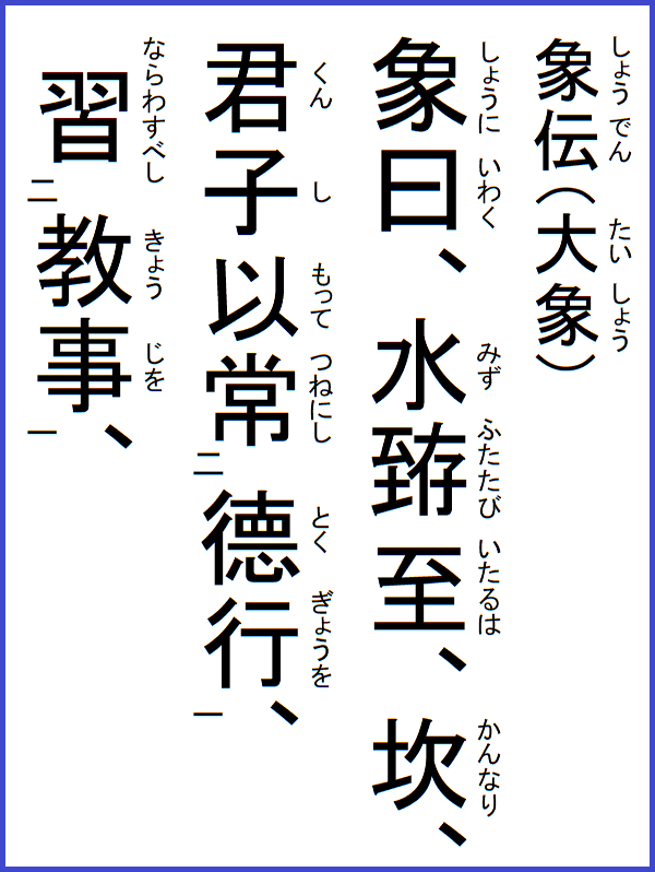 前の卦=28沢風大過 次の卦=30離為火 29坎為水 かんいすい「旧約聖書」ノアの洪水神話を構成する3卦(坎・離・咸)のひとつ。詳細はコチラ。 八卦の この卦は、八卦の |