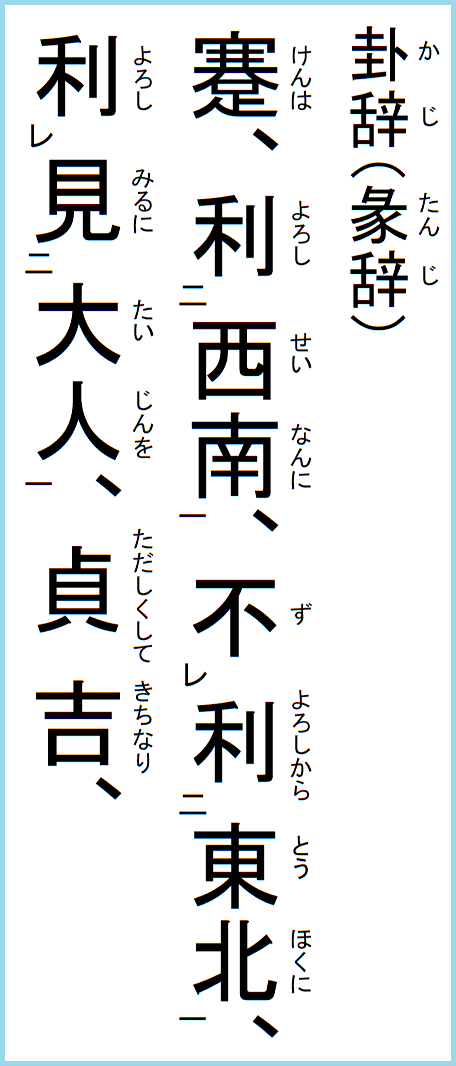象に曰く、往くは蹇あり来たれば碩いなりとは、志、内に在ればなり、大人を見るに利ろしとは、以って貴きに従えよとなり、