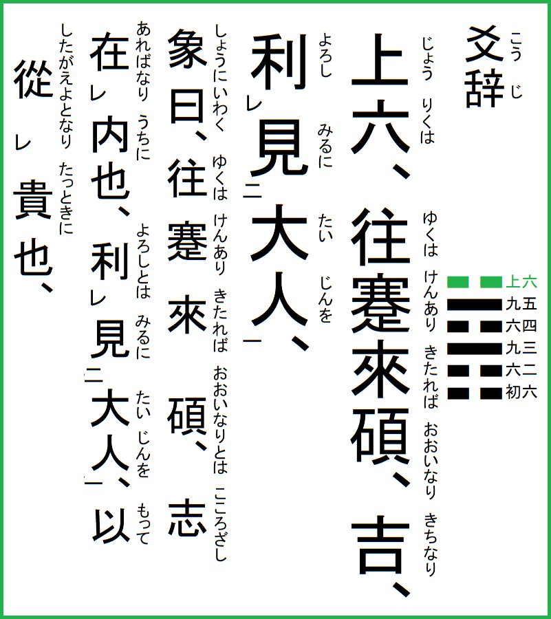 上六は、往くは蹇あり来たれば碩いなり、吉なり、大人を見るに利ろし、