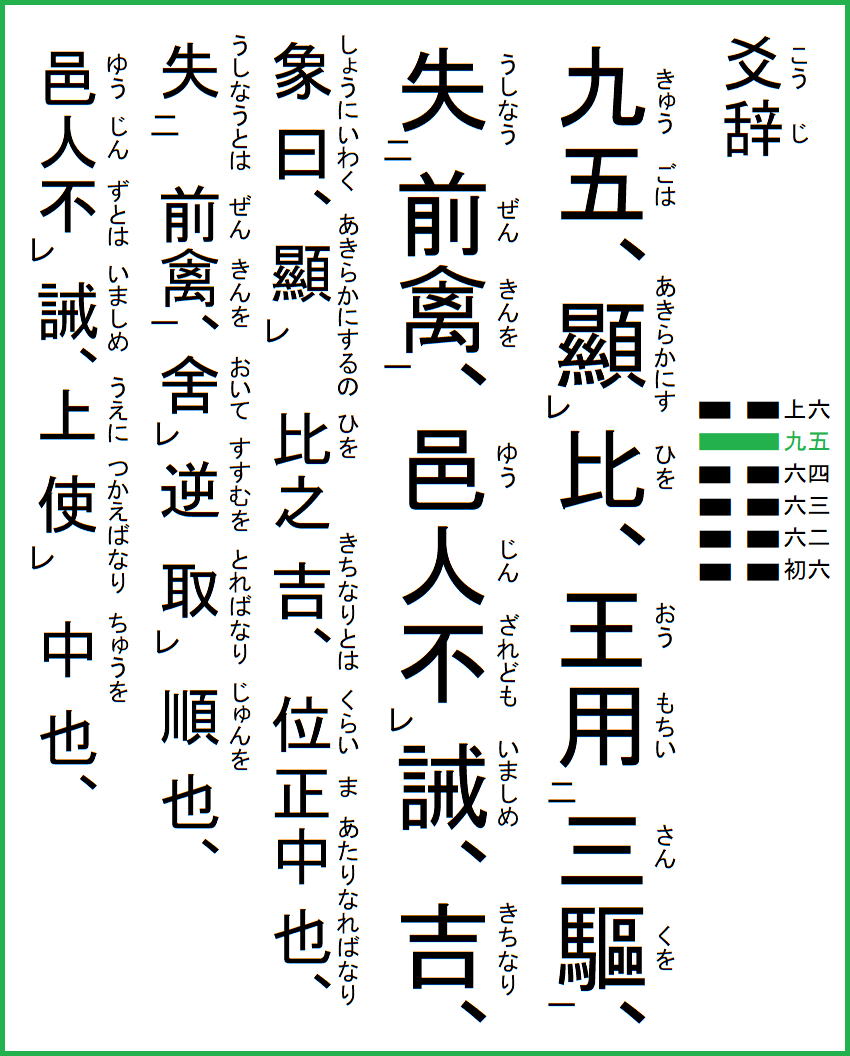 象に曰く、比を顕かにするの吉なりとは、位正中りなればなり、前禽を失うとは、逆むを舎いて順を取ればなり、邑人誡めずとは、上に中を使えばなり、