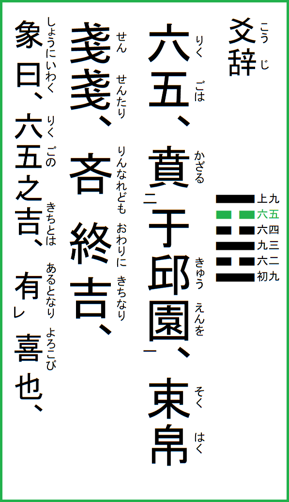 究極の易経解説 メニュー 01.乾為天 02.坤為地 03.水雷屯 04.山水蒙 05.水天需 06.天水訟 07.地水師 08.水地比 09.風天小畜 10.天沢履 11.地天泰 12.天地否 13.天火同人 14.火天大有 15.地山謙 16.雷地予 17.沢雷随 18.山風蠱 19.地沢臨 20.風地観 21.火雷噬嗑 22.山火賁 23.山地剥 24.地雷復 25.天雷无妄 26.山天大畜 27.山雷頤 28.沢風大過 29.坎為水 30.離為火 31.沢山咸 32.雷風恒 33.天山遯 34.雷天大壮 35.火地晋 36.地火明夷 37.風火家人 38.火沢睽 39.水山蹇 40.雷水解 41.山沢損 42.風雷益 43.沢天夬 44.天風姤 45.沢地萃 46.地風升 47.沢水困 48.水風井 49.沢火革 50.火風鼎 51.震為雷 52.艮為山 53.風山漸 54.雷沢帰妹 55.雷火豊 56.火山旅 57.巽為風 58.兌為沢 59.風水渙 60.水沢節 61.風沢中孚 62.雷山小過 63.水火既済 64.火水未済 |