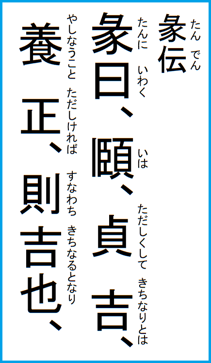 象に曰く、由って頤わる、獅、けれども吉なりとは、大いに慶び有るとなり、