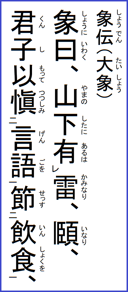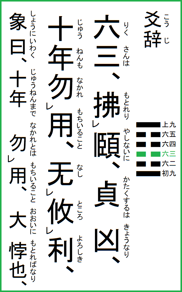 このように六三は、頤養の正道に悖り、自ら口実を求める大義にも背いているのであって、このような態度は早く悔い改めるべきである。