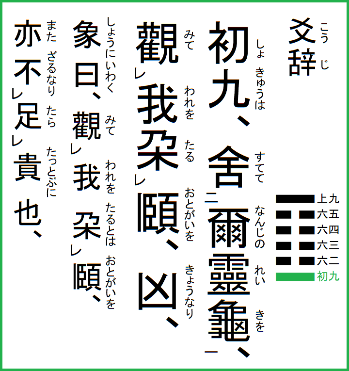 初九は、爾の霊亀を舎てて、我を観て頤を朶る、凶なり、