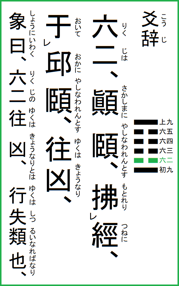 六二は、顛に頤われんとす、経に払れり、邱に于いて頤われんとす、征くは凶なり、