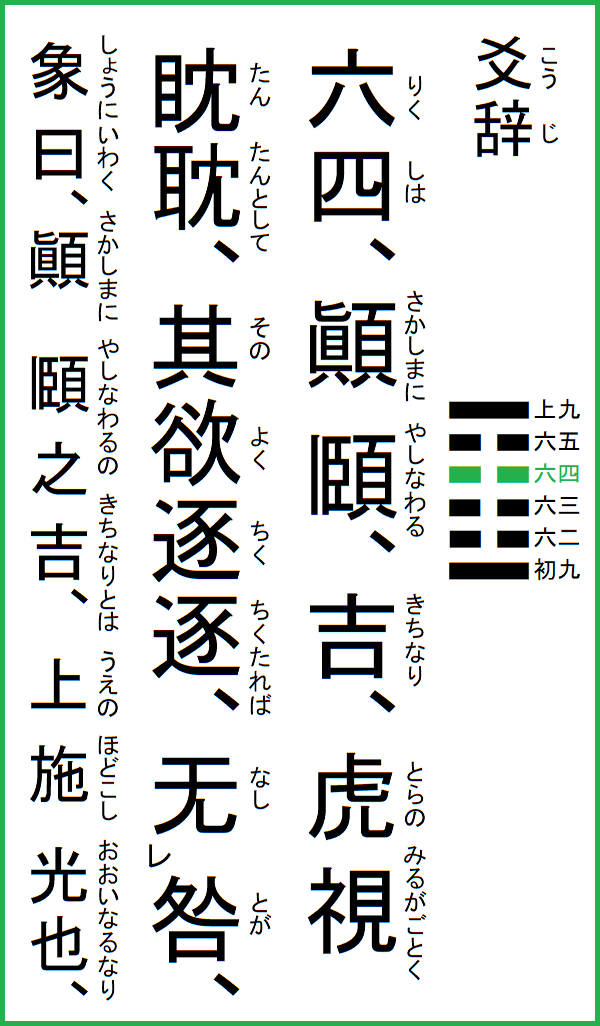 六四は、顛に頤わる、吉なり、虎の視るがごとく眈々として、其の欲逐逐たれば、咎无し、