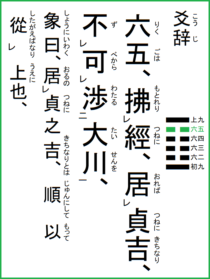 六五は、経に払れり、貞に居れば吉なり、大川を渉る可からず、