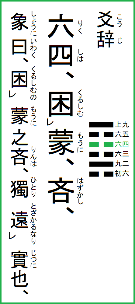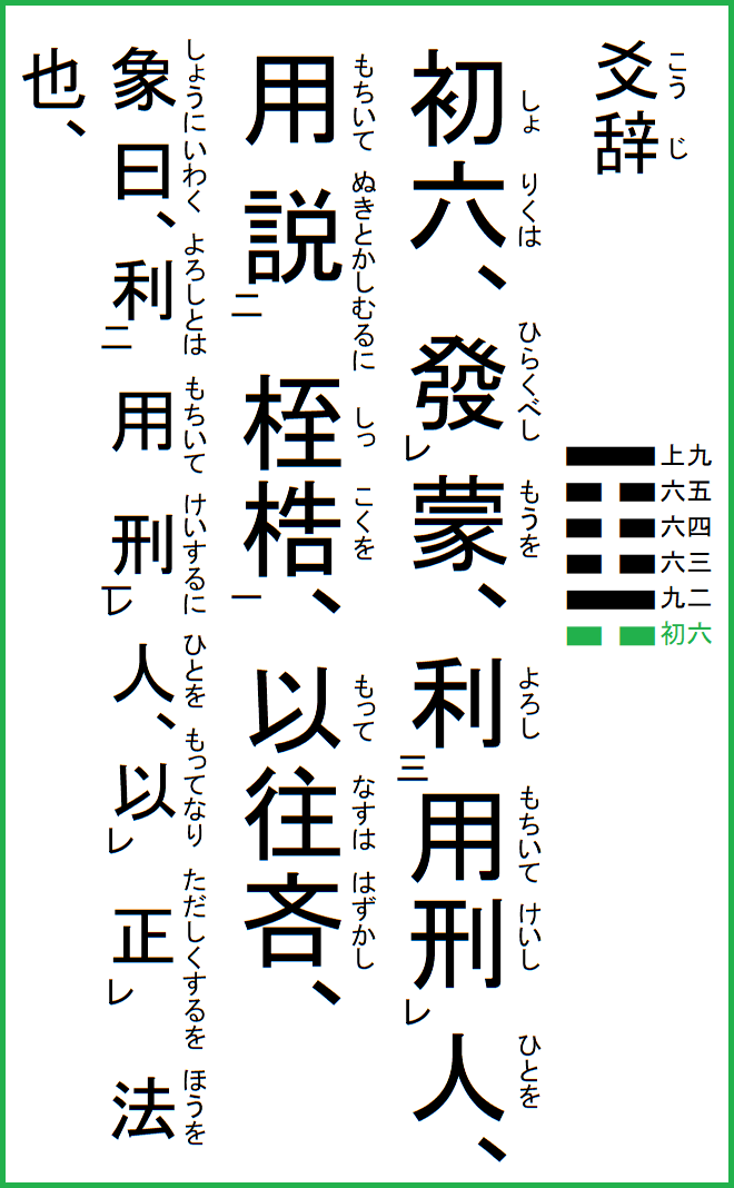 究極の易経解説 メニュー 01.乾為天 02.坤為地 03.水雷屯 04.山水蒙 05.水天需 06.天水訟 07.地水師 08.水地比 09.風天小畜 10.天沢履 11.地天泰 12.天地否 13.天火同人 14.火天大有 15.地山謙 16.雷地予 17.沢雷随 18.山風蠱 19.地沢臨 20.風地観 21.火雷噬嗑 22.山火賁 23.山地剥 24.地雷復 25.天雷无妄 26.山天大畜 27.山雷頤 28.沢風大過 29.坎為水 30.離為火 31.沢山咸 32.雷風恒 33.天山遯 34.雷天大壮 35.火地晋 36.地火明夷 37.風火家人 38.火沢睽 39.水山蹇 40.雷水解 41.山沢損 42.風雷益 43.沢天夬 44.天風姤 45.沢地萃 46.地風升 47.沢水困 48.水風井 49.沢火革 50.火風鼎 51.震為雷 52.艮為山 53.風山漸 54.雷沢帰妹 55.雷火豊 56.火山旅 57.巽為風 58.兌為沢 59.風水渙 60.水沢節 61.風沢中孚 62.雷山小過 63.水火既済 64.火水未済 |