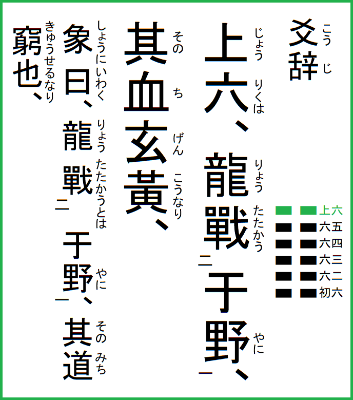 究極の易経解説 メニュー 01.乾為天 02.坤為地 03.水雷屯 04.山水蒙 05.水天需 06.天水訟 07.地水師 08.水地比 09.風天小畜 10.天沢履 11.地天泰 12.天地否 13.天火同人 14.火天大有 15.地山謙 16.雷地予 17.沢雷随 18.山風蠱 19.地沢臨 20.風地観 21.火雷噬嗑 22.山火賁 23.山地剥 24.地雷復 25.天雷无妄 26.山天大畜 27.山雷頤 28.沢風大過 29.坎為水 30.離為火 31.沢山咸 32.雷風恒 33.天山遯 34.雷天大壮 35.火地晋 36.地火明夷 37.風火家人 38.火沢睽 39.水山蹇 40.雷水解 41.山沢損 42.風雷益 43.沢天夬 44.天風姤 45.沢地萃 46.地風升 47.沢水困 48.水風井 49.沢火革 50.火風鼎 51.震為雷 52.艮為山 53.風山漸 54.雷沢帰妹 55.雷火豊 56.火山旅 57.巽為風 58.兌為沢 59.風水渙 60.水沢節 61.風沢中孚 62.雷山小過 63.水火既済 64.火水未済 |