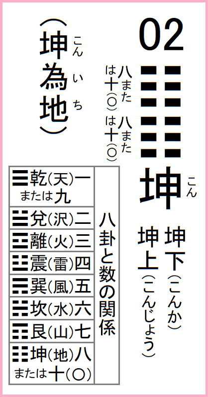 前の卦=01乾為天 次の卦=03水雷屯 02坤為地 こんいち「旧約聖書」天地創造1日目を構成する5卦(未済・乾・坤・屯・蒙)のひとつ。詳細はコチラ。 八卦の 坤とは、従順、おとなしい、といった意味。