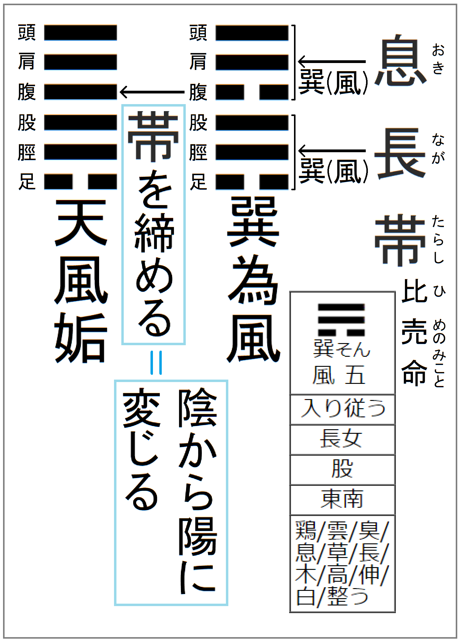 易の専門的なことになってしまうが、息と長という字は八卦の☴巽(風)が示す事象なので、息長の二文字は☴巽(風)を重ねた䷸巽為風という卦を示していることになる。