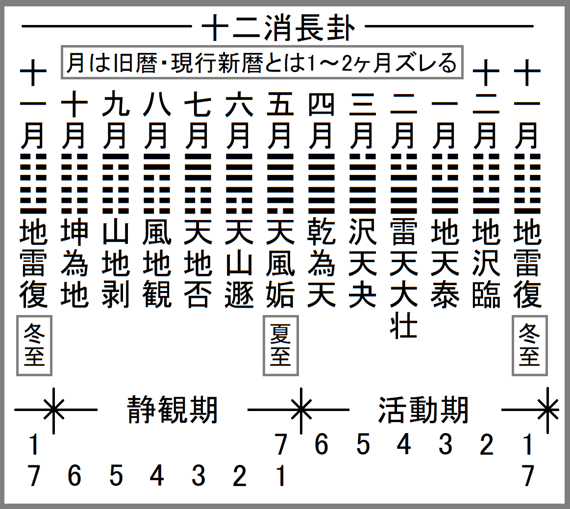 一年十二ヶ月を易の卦で表現すると次図のようになり、これらは十二消長卦と呼ばれている。