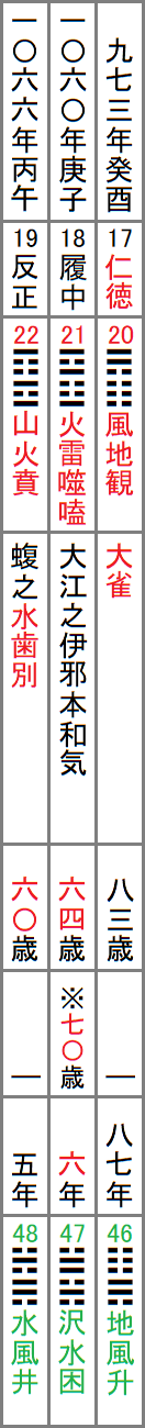 この表は、上から日本書紀による各天皇の即位元年、漢風諡号、A列の卦、古事記による国風諡号、崩御時の年齢、日本書紀による崩御時の年齢、崩年、B列の卦、と並べたもので、赤字の部分はA列と繋がる箇所、緑字の部分はB列と繋がる箇所である。