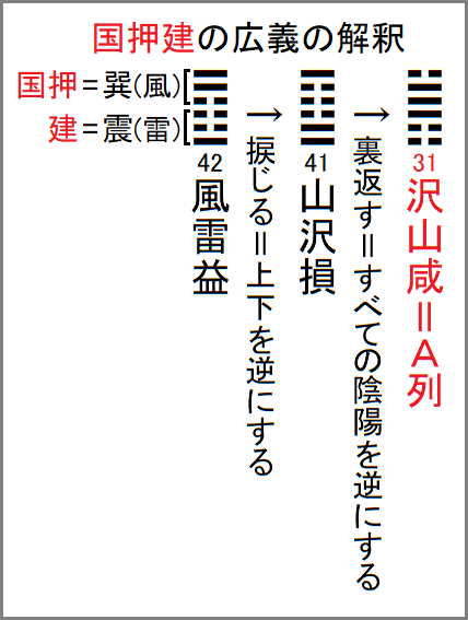 国風諡号の上四文字の広国押建は、「国押建が示すところを広義に解釈せよ」との暗号とすれば、左図のように、国押は6孝安天皇の国押人と同様に☴巽(風)、建は22雄略天皇のときと同様に☳震(雷)とすれば、国押建でA列31䷞沢山咸の裏卦の41䷨山沢損を逆方向から見た42䷩風雷益を示していることになる。