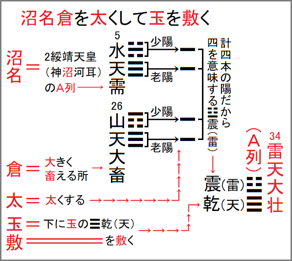国風諡号の上三文字の沼名倉は、沼名は名前に沼の字が付く天皇のA列を指すものとすれば、それは2綏靖天皇(神沼河耳)だから5䷄水天需となる。