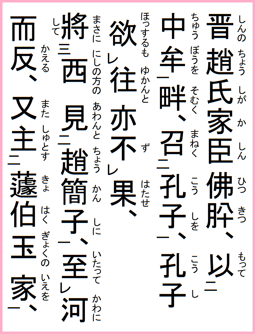 しかし河水のほとりに至り来たとき、簡子はその国の賢大夫を殺したと聞いて、すぐに引き返した。