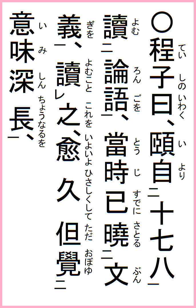 程子の曰く、頤十七八自り論語を読む、当時已に文義を暁る、之を読むこと愈久しくして但意味深長なることを覚ゆ、
