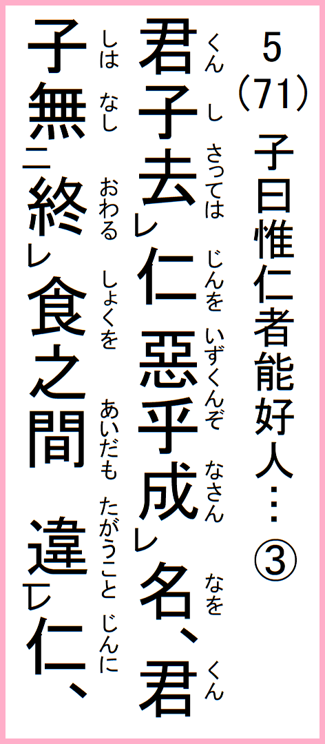 君子は仁を捨てたら、君子として名を成すことはない。君子はいついかなる時も、食事中も仁に違わないよう心掛けるものである。