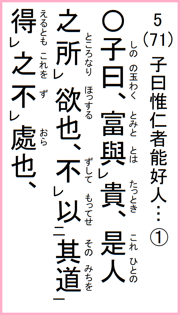 子の曰く、富と貴きとは、是れ人の欲する所なり、其の道を以ってせずして得るとも処らず、